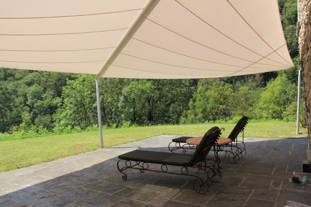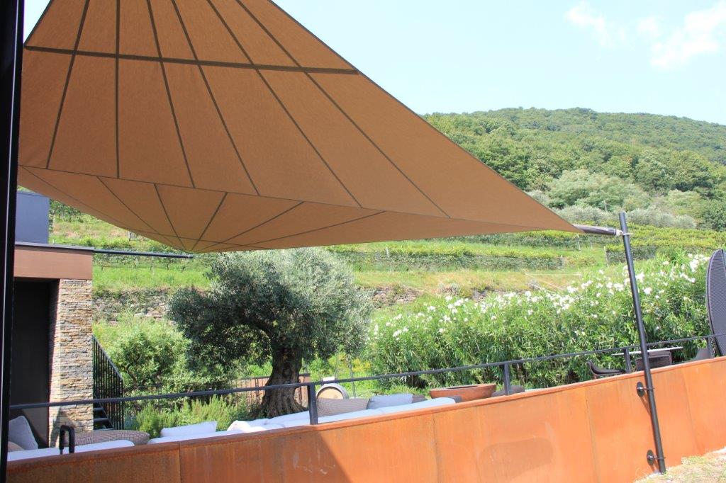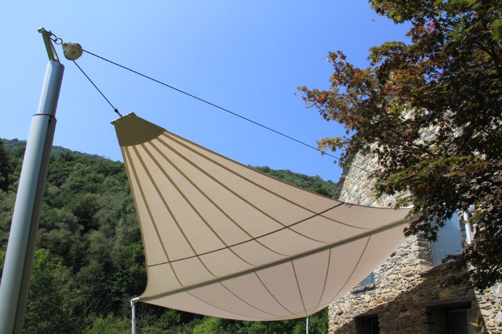 Strahlensegel als Sonnenschutz über Sitzplatz